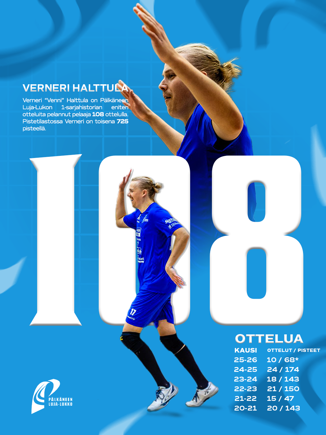 Kaksi Luja-Lukon lentopalloilijaa saavutti merkittävän rajapyykin alkukauden aikana. Sentteri Verneri Halttulalle ja laituri Tomi Perkiölle tuli täyteen sata ykkössarjan runkosarjaottelua…